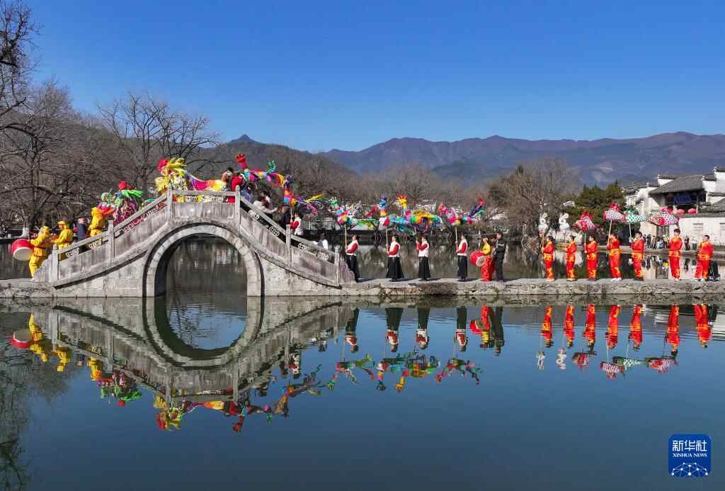 1月18日,民俗表演队伍在安徽省黄山市黟县宏村巡游(无人机照片)。