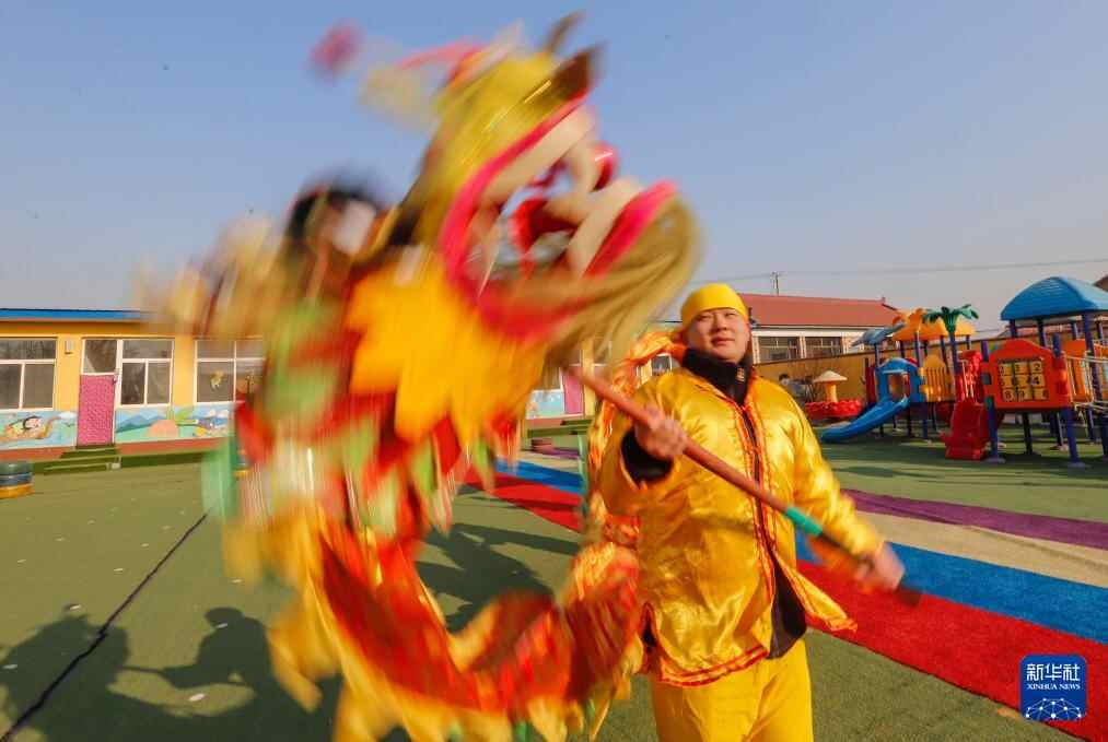 1月18日,河北省遵化市平安城镇大麻各庄村的学生在练习舞龙。