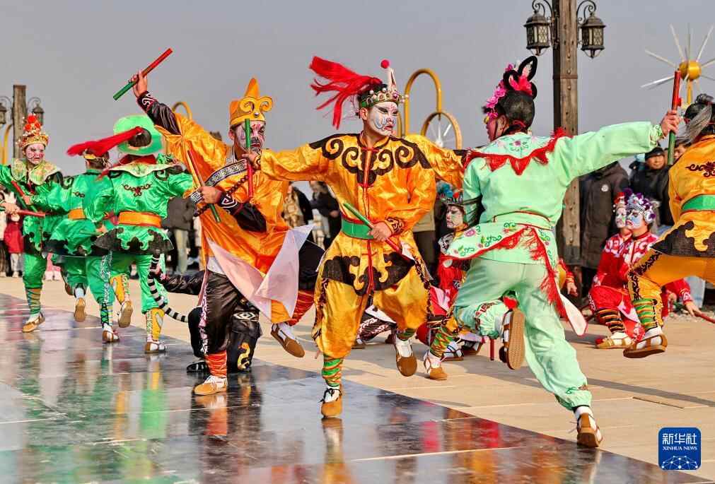 1月18日,在河北省秦皇岛市的秦皇岛港口工业旅游区,演员为游客表演潮汕英歌舞。