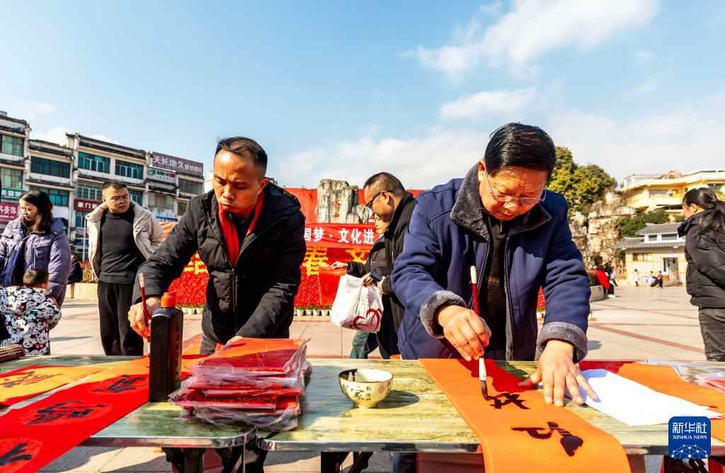 1月18日,书法爱好者在贵州省黔西市水西广场为市民写春联。