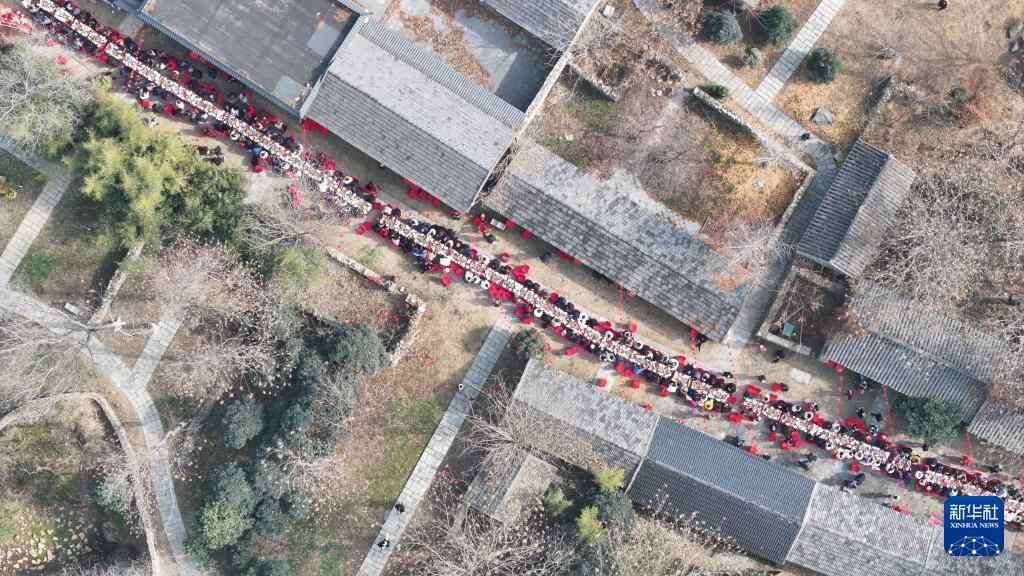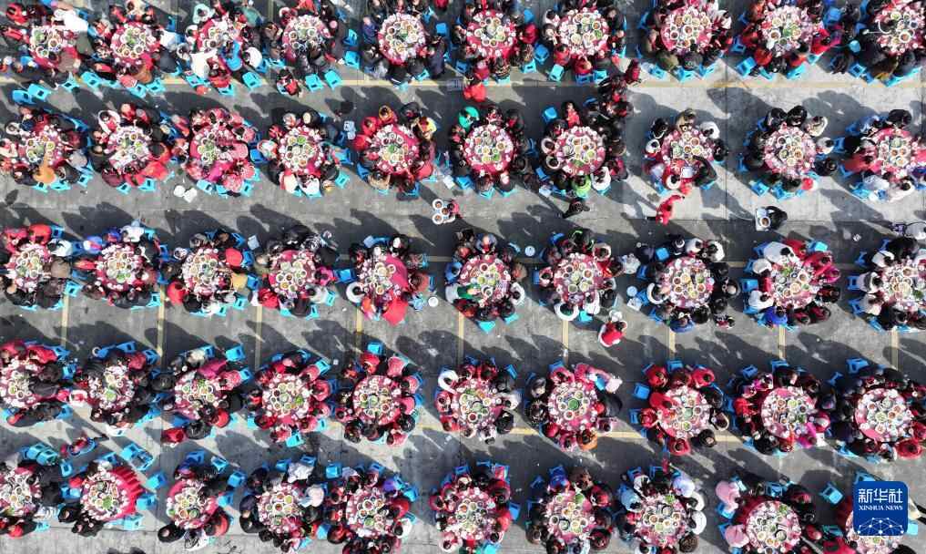 1月18日,在四川省成都市彭州市通济镇阳平社区,人们参加坝坝宴,叙乡情、迎新春(无人机照片)。