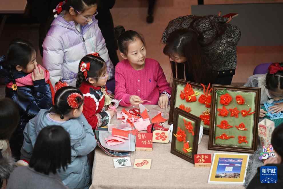 1月18日,在天津市少年儿童活动中心,小朋友在娃娃庙会上体验剪纸。