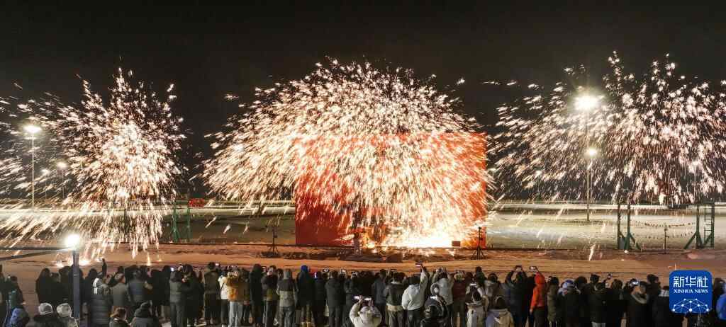 1月17日,游客在河北省遵化市团瓢庄镇山庄雪乡景区观看打铁花(无人机照片)。
