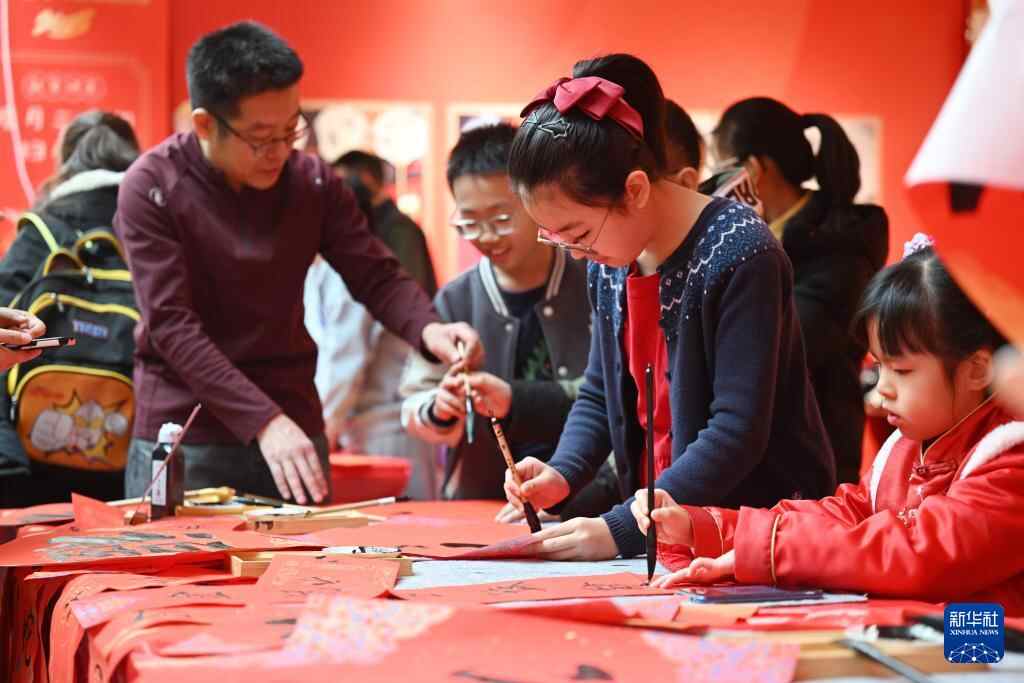 1月18日,在天津市少年儿童活动中心,小朋友在娃娃庙会上写春联。