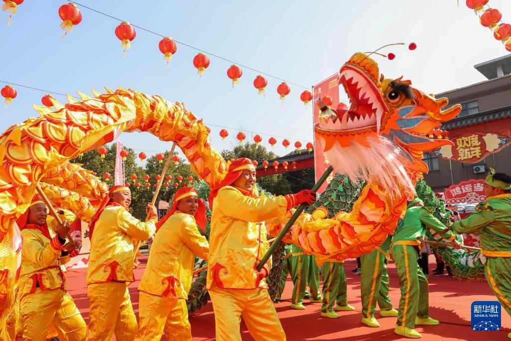 1月18日,在浙江省湖州市德清县新市镇蔡界村举办的“新春欢歌奔富途 瑞蛇迎春福满乡”村落文化节上,村民在舞龙。
