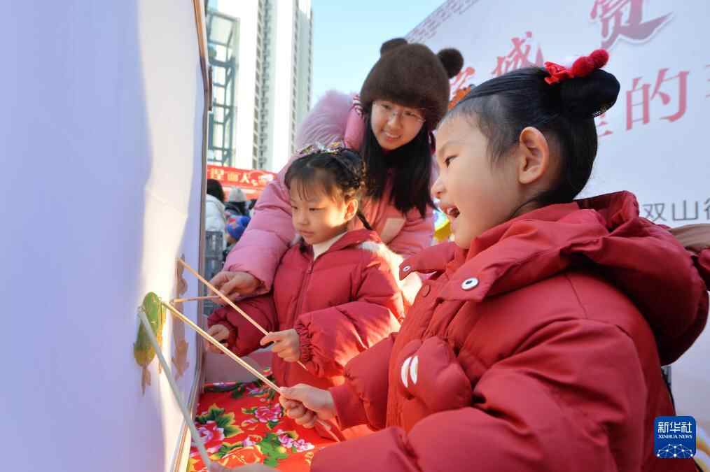 1月17日,在山东青岛宝城幼儿园开展的“赏非遗 迎新春”主题活动上,小朋友在老师的指导下体验皮影戏表演。