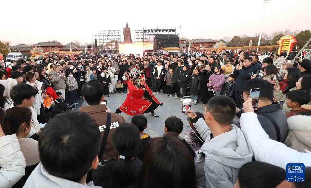 1月18日,在江苏省淮安市洪泽区老子山镇龟山村举办的民俗文化市集,游客在观看民俗节目表演。