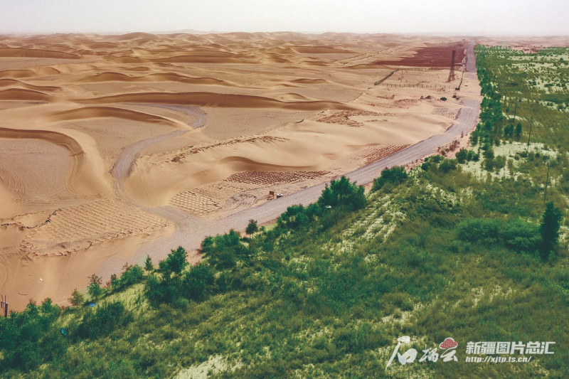俯瞰且末县河东治沙基地成形的防沙林带。(资料图)