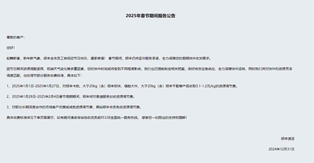 2025年1月28日-2025年2月4日春节假期期间,顺丰将对寄递服务加收资源调节费。