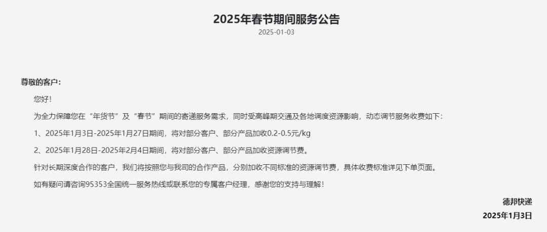 德邦快递为全力保障消费者在“年货节”及“春节”期间的寄递服务需求,将动态调节服务收费。