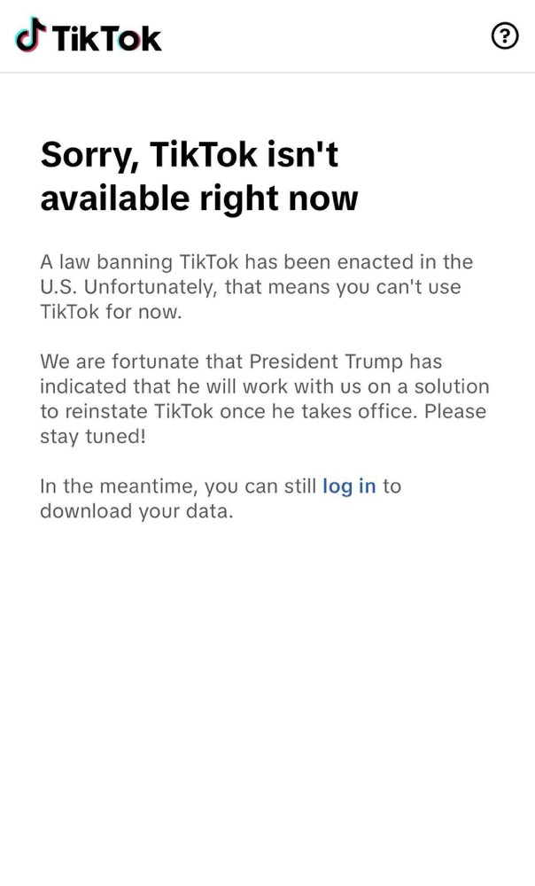 TikTok的通知内容显示:“我们很遗憾,一项封禁TikTok的美国法律将于1月19日生效,并迫使我们暂时停止提供服务。我们正尽快努力在美国恢复我们的服务,我们感谢各位的支持。请保持关注。”