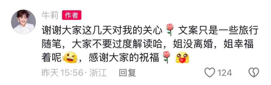 记者注意到,牛莉也在此前受争议的视频下方评论,称:“谢谢大家这几天对我的关心,文案只是一些旅行随笔,大家不要过度解读哈,姐没离婚,姐幸福着呢,感谢大家的祝福。”