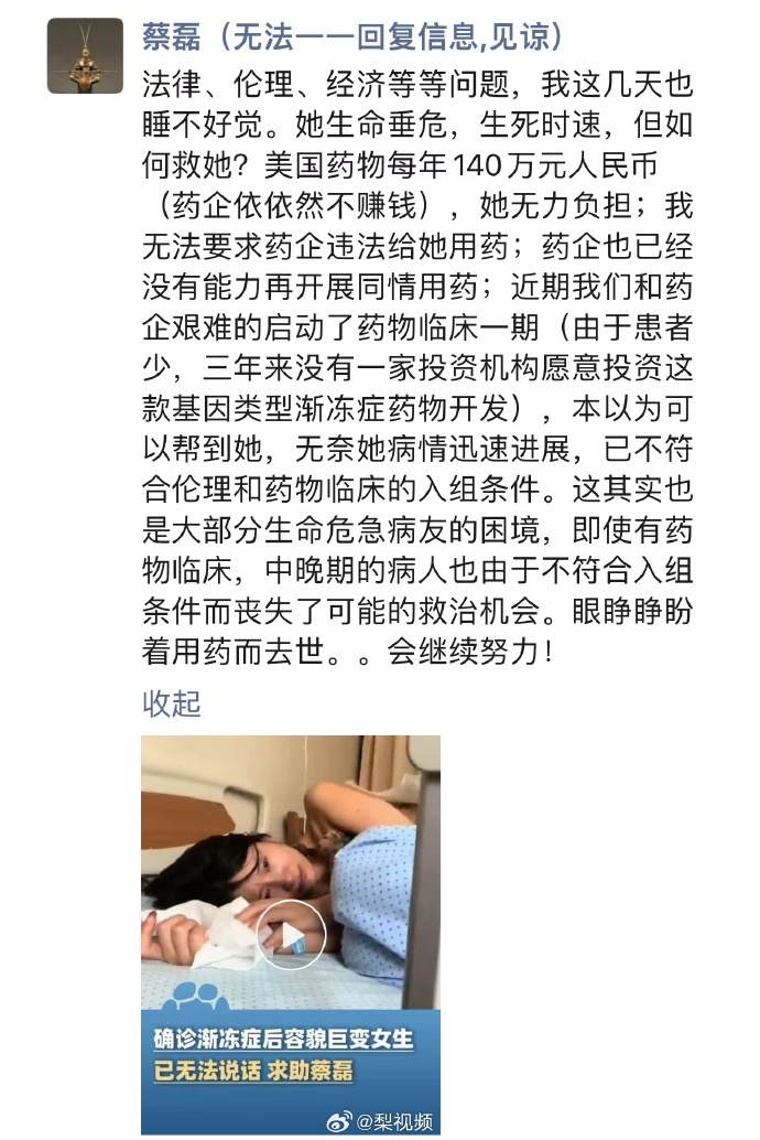 “法律、伦理、经济等等问题,我这几天也睡不好觉。她生命垂危,生死时速,但如何救她?美国药物每年140万元人民币(药企依然不赚钱),她无力负担;我无法要求药企违法给她用药;药企也已经没有能力再开展同情用药;近期我们和药企艰难的启动了药物临床一期(由于患者少,三年来没有一家投资机构愿意投资这款基因类型渐冻症药物开发),本以为可以帮到她,无奈她病情迅速进展,已不符合伦理和药物临床的入组条件。这其实也是大部分生命危急病友的困境,即使有药物临床,中晚期的病人也由于不符合入组条件而丧失了可能的救治机会。眼睁睁盼着用药而去世。会继续努力!”