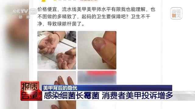 记者调查发现,近几年有关消费者美甲的投诉增多,这位消费者称:价格便宜,美甲师水平有限也能理解,但起码卫生要保障,由于卫生不干净导致她感染了绿脓杆菌;而这位消费者声称美甲后,她的指甲长了霉菌,她怀疑就是美甲的技术不到位或者是工具没有消毒。而有的消费者甚至反映在美甲过程中,修剪过度或者是打磨过度出现了出血的情况。