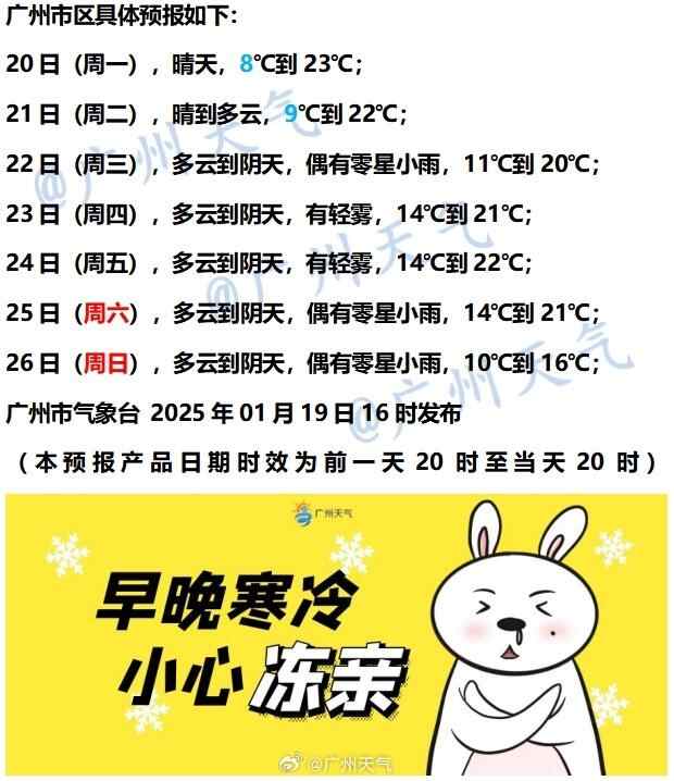 19-20日,全省大部晴天,粤西和珠江三角洲市县早晚有轻雾。最低气温:粤北大部、珠江三角洲北部市县4~7℃,南部沿海市县11~14℃,其余市县7~11℃。