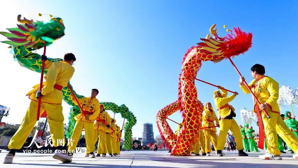春节即将到来,甘肃省张掖市甘州区非遗保护中心的工作人员与非遗爱好者们一起,加紧排练《龙腾盛世》《祥狮狂舞》《百龙迎春》《大秧歌》《威风锣鼓》等非物质文化遗产甘州社火节目,准备在春节期间为广大市民呈现精彩表演。王将摄(人民图片网)