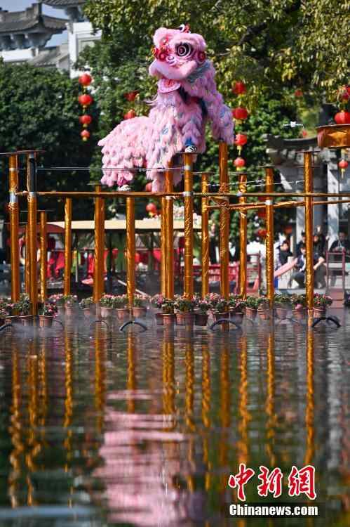 1月19日,广东广州,岭南醒狮在高桩上表演。当日,广州宝墨园景区举办2025年新春岭南醒狮民俗文化节活动,为游客带来“幻彩群狮闹新春”“雄狮少年攀高峰”“雄狮高桩走索争霸夺宝”等一系岭南醒狮艺术展演。中新社记者 陈骥旻 摄