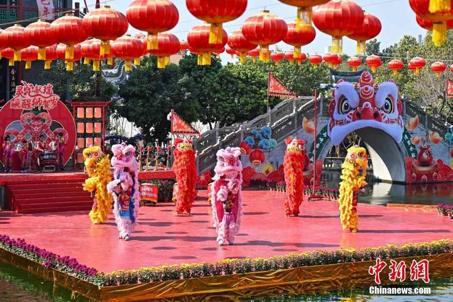 1月19日,广东广州,岭南醒狮在水上舞台表演。当日,广州宝墨园景区举办2025年新春岭南醒狮民俗文化节活动,为游客带来“幻彩群狮闹新春”“雄狮少年攀高峰”“雄狮高桩走索争霸夺宝”等一系岭南醒狮艺术展演。中新社记者 陈骥旻 摄