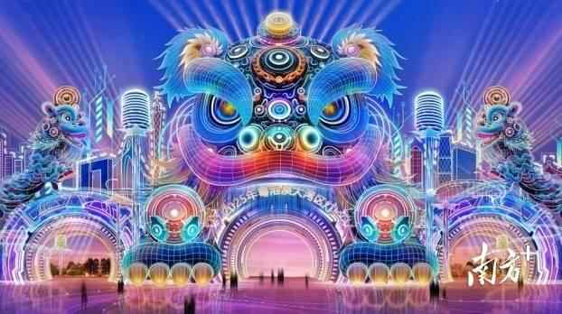 赛博醒狮天穹式大门,将传统舞狮与现代科技、未来主义朋克风格相融合,创造出一种前所未有的视觉盛宴。