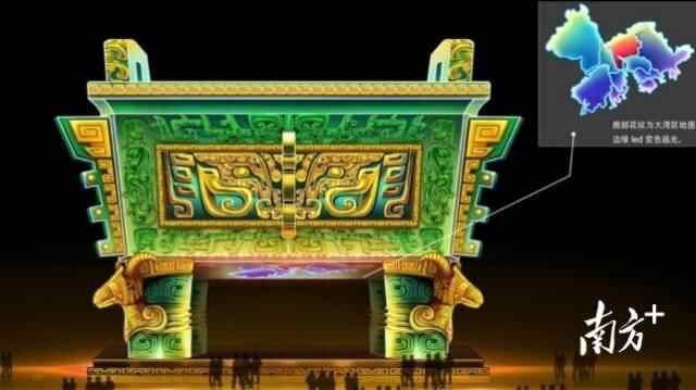 核心设计理念是传递民族自信与力量,结合鼎文化和大湾区的发展蓝图,造型上融合传统与现代,绘制祥云、瑞兽及大湾区地图等多样化符号,凭借先进灯光技术模拟日出、灯火与科技之光,传递出满满的古典文化气息和现代发展之风。