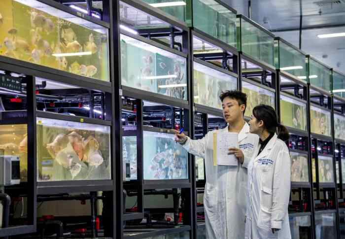 2024年11月27日,在西部(重庆)科学城种质创制大科学中心养殖室,研究人员观察记录新品种罗非鱼的生长情况。新华社记者刘潺摄