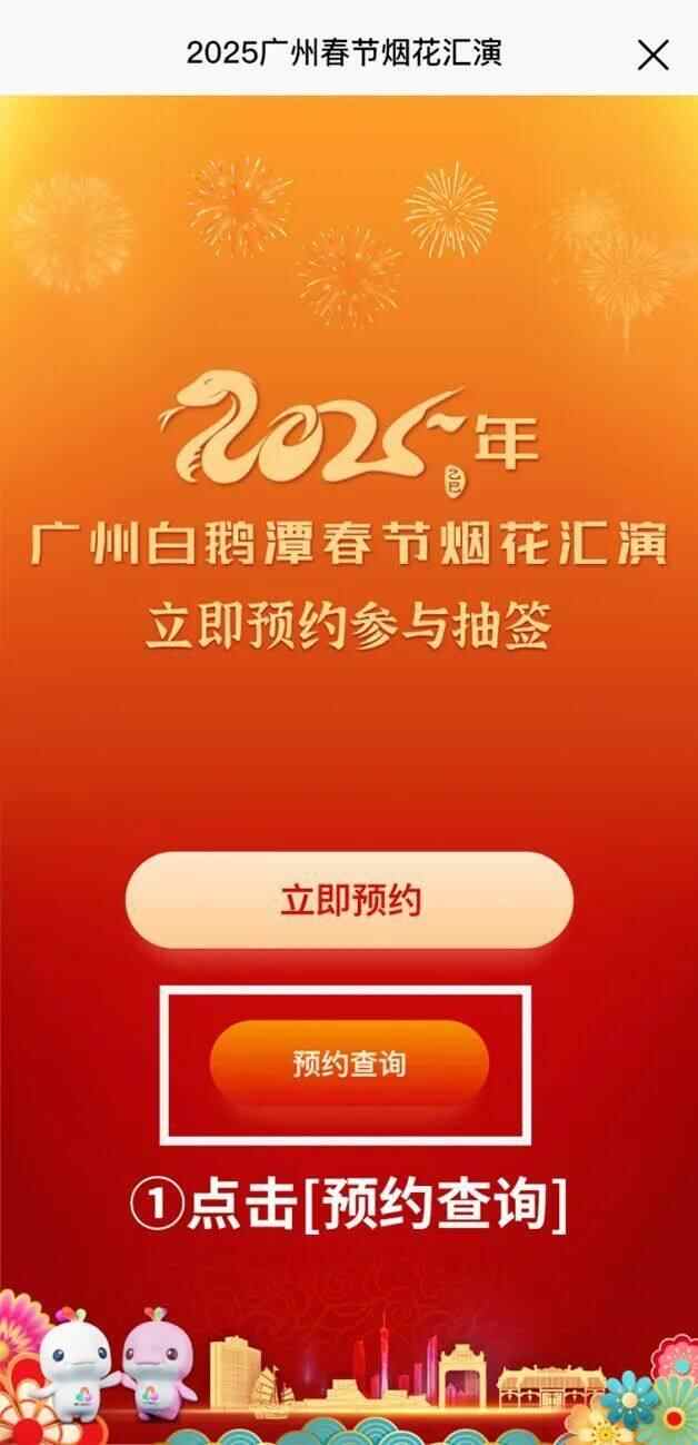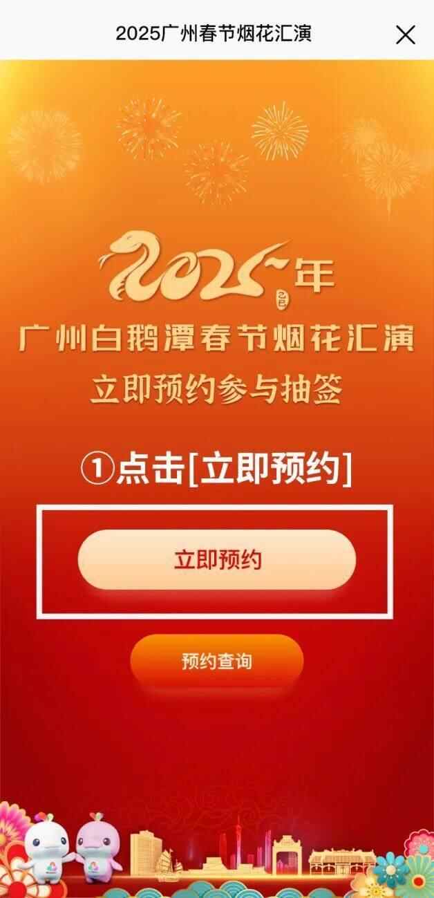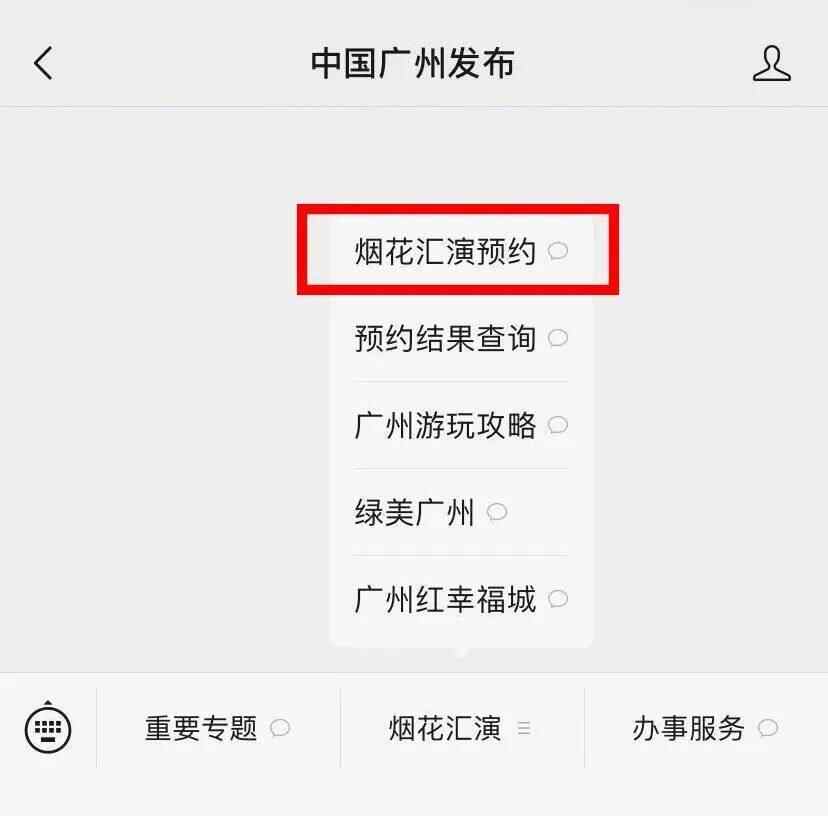 搜索关注“中国广州发布”微信公众号,点击主页菜单栏“烟花汇演——点击烟花汇演预约”进入预约页面。