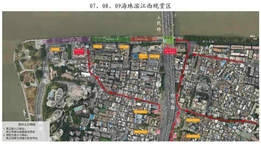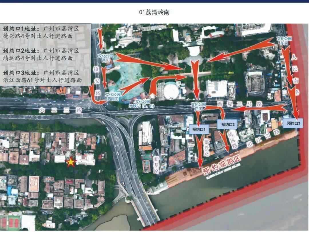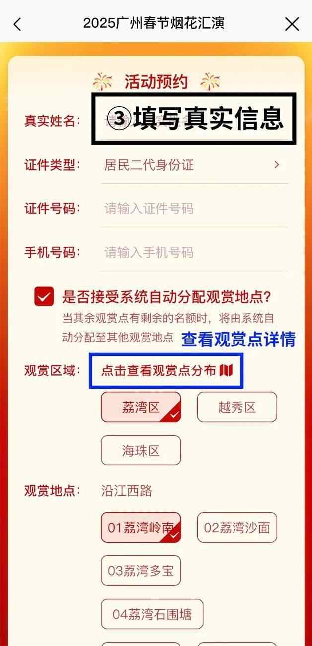 预约时可自行选择观赏区域(荔湾、越秀、海珠),中签后由系统分配预选观赏点,请按照中签信息提前安排行程,按时进入指定观赏点。中签预约单不可转让出售。