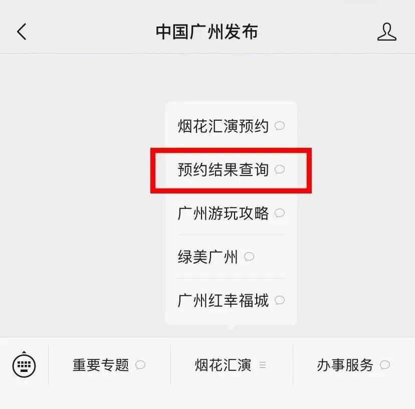 搜索关注“中国广州发布”微信公众号,点击主页菜单栏“烟花汇演——预约结果查询”进入查询页面。