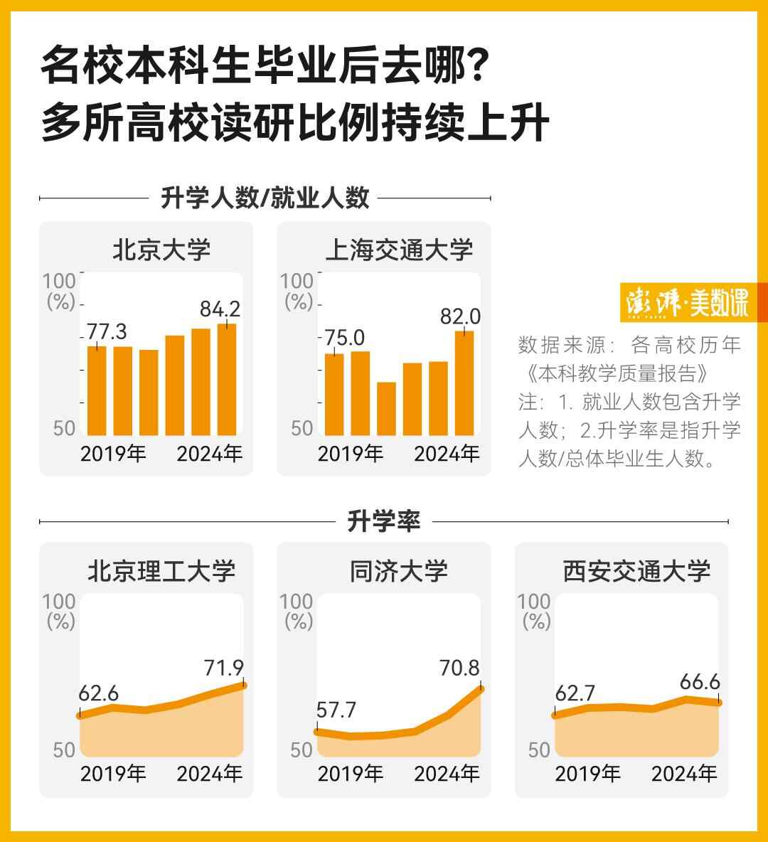 以北京大学为例,2024年里,100个实际就业的人当中,有84.2个人选择了升学,这比2019年多了6.9%的比例。
