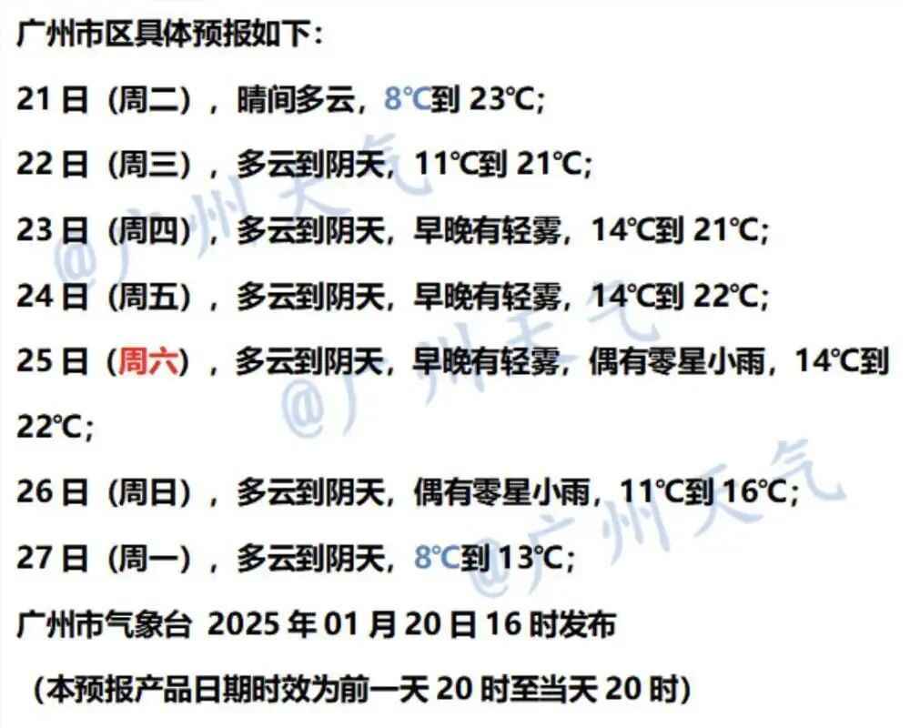 广州市气象台1月20日傍晚市区七天预报 图/@广州天气