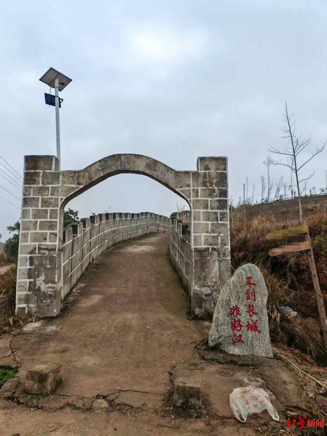 村民称以前山上缺水,谢某还在山上挖了几个堰塘,从山下抽水到山上储水,平时,还有村民在山上锄草、修枝打零工。此外,谢某还在山上修建了“长城”。记者看到,该村民口中的“长城”,其实是沿山脊修建的约两米宽的步行道,两侧砌了1米多高的砖墙,目测有两三公里长,一入口处的石头上写着:“不到长城,非好汉”。