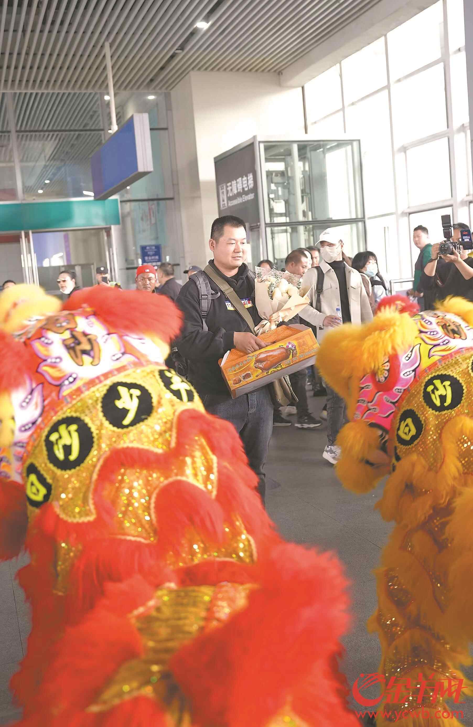 从广西桂林来东莞的蒋女士一抵达东莞虎门高铁站,就被鲜花和烧鹅包围,她兴奋地告诉记者,因为父母在东莞务工,今年选择来东莞团聚。“感受到东莞的包容和热情,很开心!”