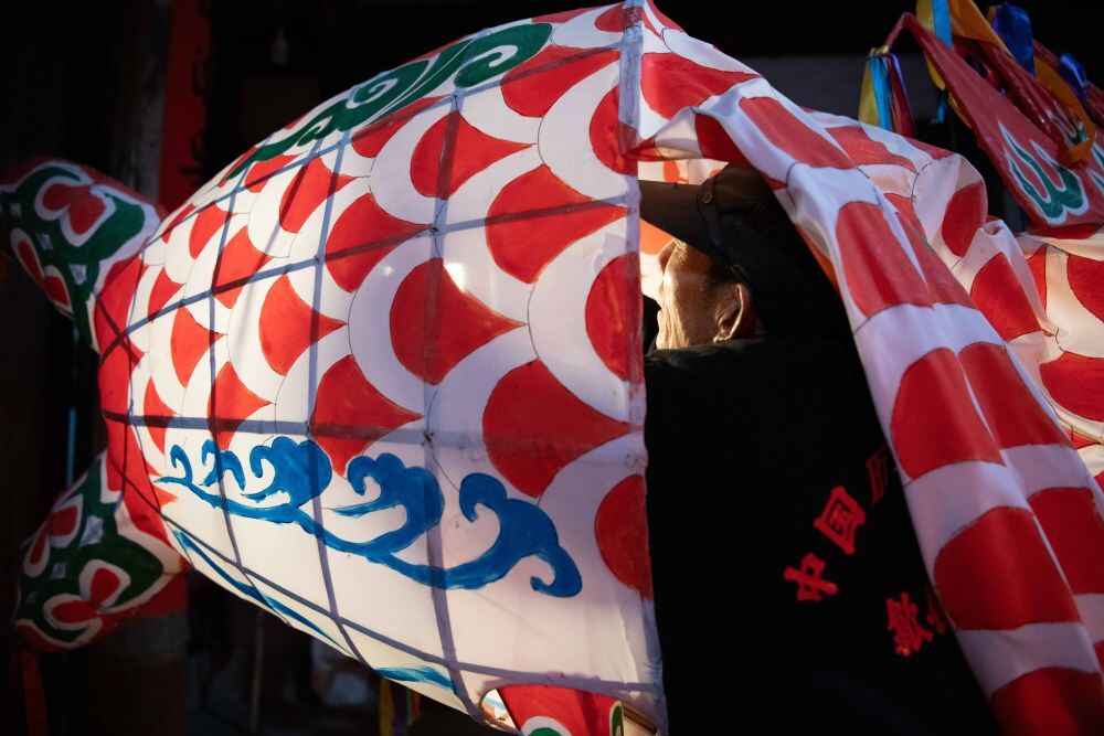 1月8日,在安徽省黄山市歙县北岸镇瞻淇村一处祠堂里,村民点亮鱼灯,准备在村里舞灯。