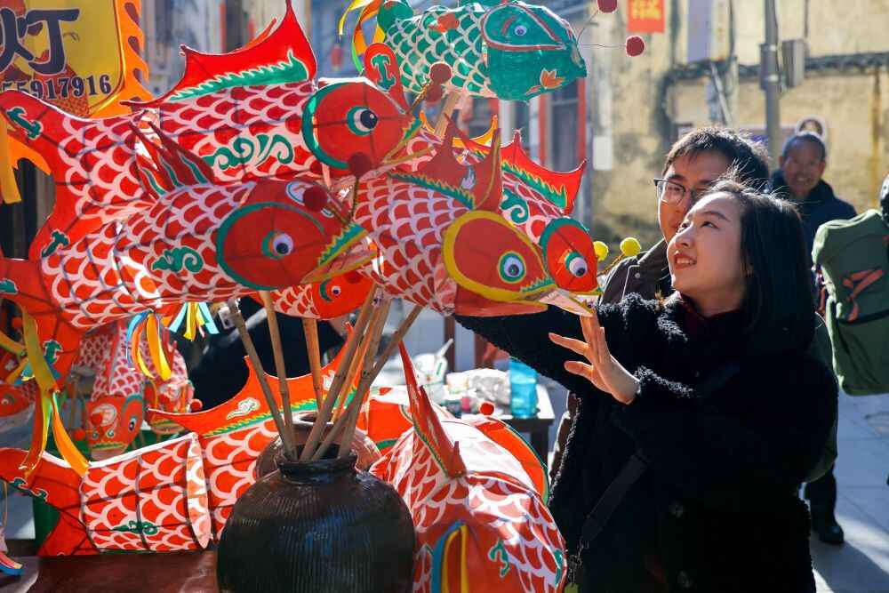 1月18日,在安徽省黄山市歙县北岸镇瞻淇村,游客在选购鱼灯。新华社发(樊成柱 摄)