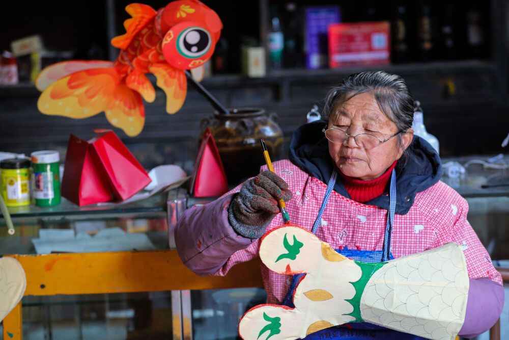 1月18日,在安徽省黄山市歙县北岸镇瞻淇村,村民汪文英在制作鱼灯。新华社发(樊成柱 摄)