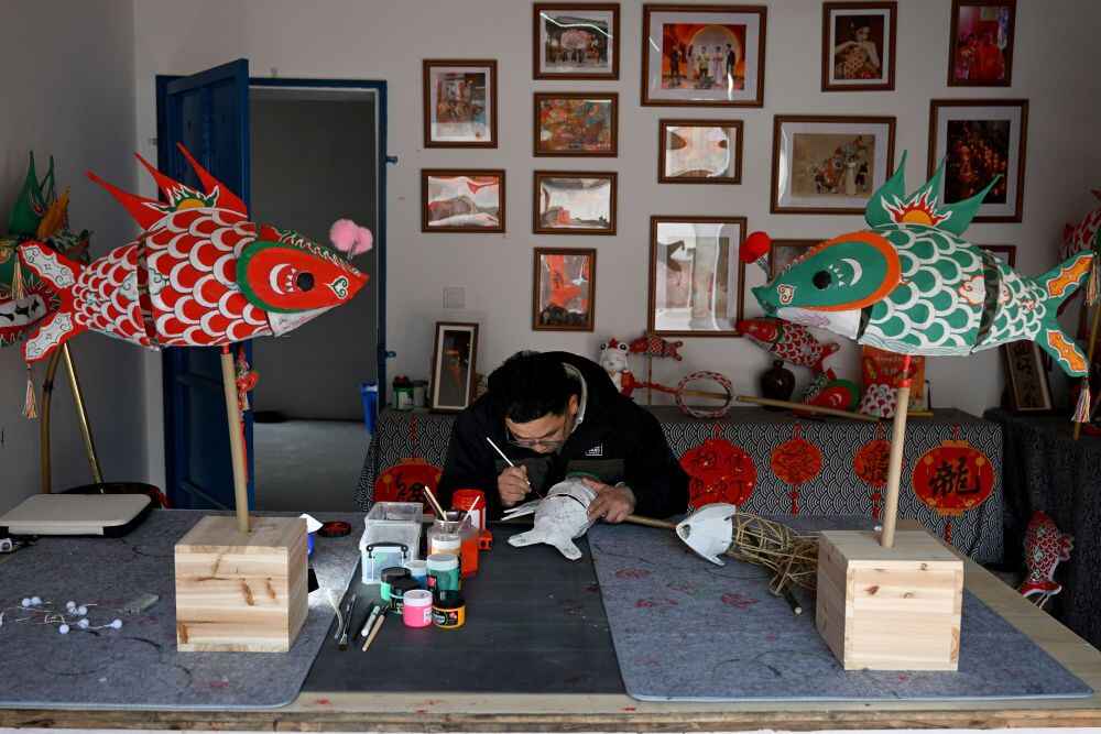 1月6日,在安徽省黄山市歙县北岸镇瞻淇村,瞻淇鱼灯非遗传承人汪宇昉在工作室里展示鱼灯。
