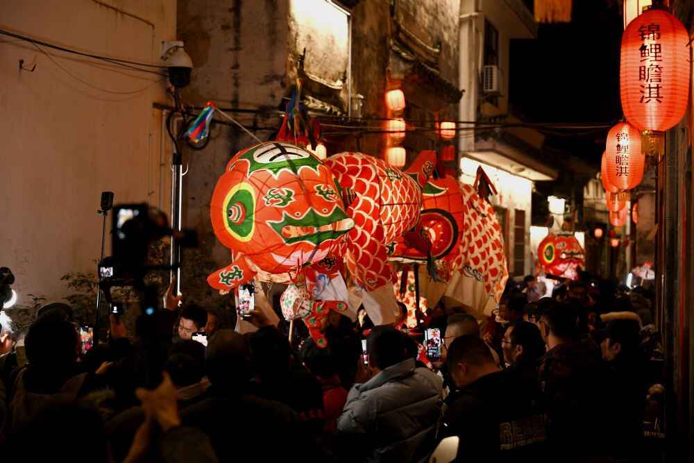 临近春节,安徽省黄山市歙县瞻淇村举行了数场鱼灯巡游活动,众多游客来到这里,感受这座千年古村的独特风景。