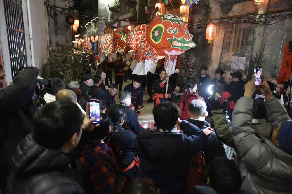 1月8日晚,安徽省黄山市歙县北岸镇瞻淇村鱼灯队在村里表演。