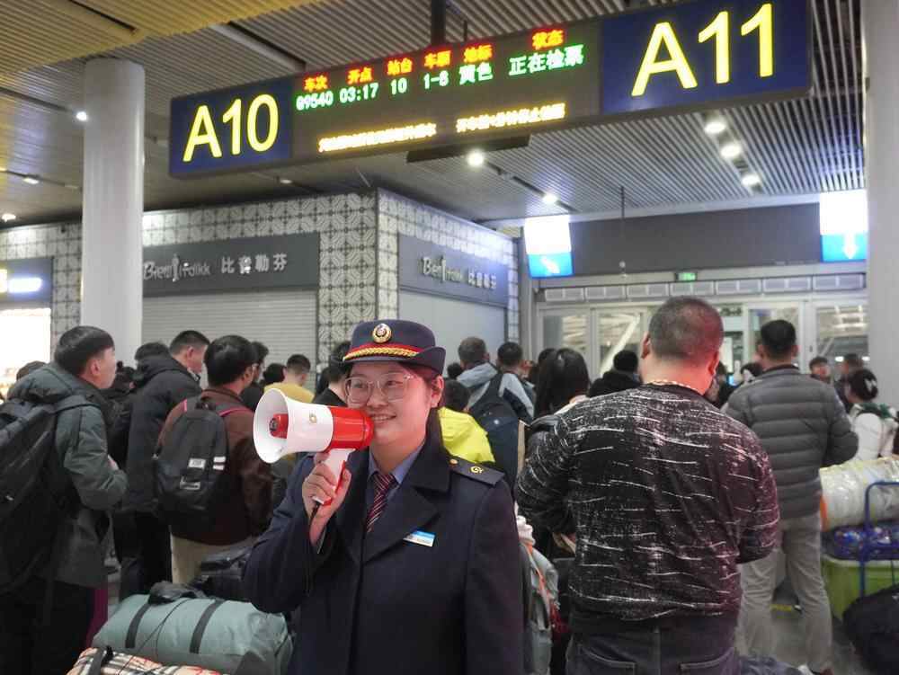 1时9分,A12-13检票口前人头攒动,客运员张玉洁正手持扩音器,用清脆的声音引导旅客有序排队检票。她不时协助老人拿行李、提醒旅客注意保管好身份证。在她的有序引导下,检票口前井然有序。