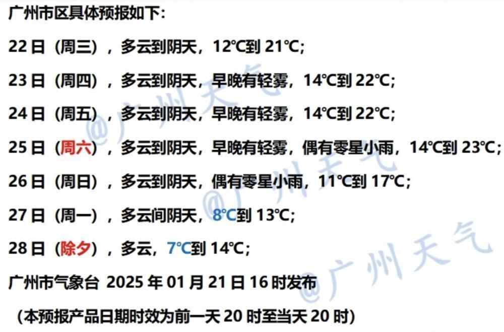 结合广州市气象台预计,26日强冷空气前锋过境后,广州将转阴冷天气,伴有7~9℃左右过程降温,预计27日至28日(年廿八至年廿九除夕),广州市区最低气温将降至8~7℃。30日(大年初二)起广州转多云天气,气温缓慢回升。