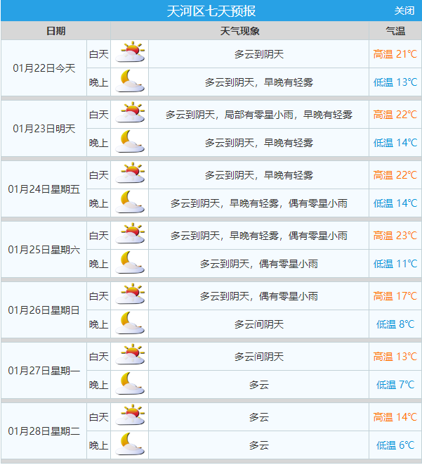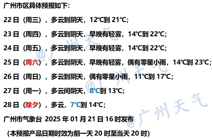 广州市气象台预计,21日仍然天气晴朗,适合洗晒;22日起云量增多,早晚有轻雾,局部偶有零星小雨;26日起新一股中等偏强甚至较强冷空气来袭,日均气温下降8℃左右。