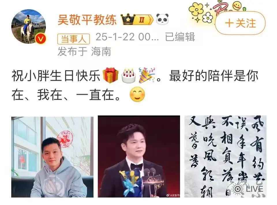 吴敬平教练凌晨发文:祝小胖生日快乐最好的陪伴是你在、我在、一直在。