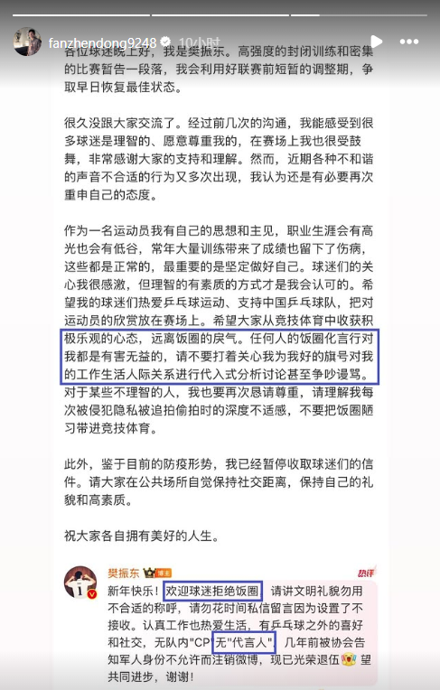 此次樊振东再次将这段话特别圈出,表明了自己的立场:反对饭圈化。如他所说,部分粉丝的饭圈行为,已经对运动员造成了非常大的影响。
