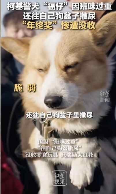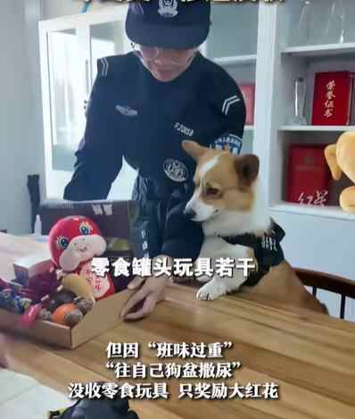 近日,山东潍坊。柯基警犬福仔因2024年表现不错,顺利完成了不少安保任务,为潍坊警犬宣传做出了贡献,被奖励红花一枚,零食罐头玩具若干。