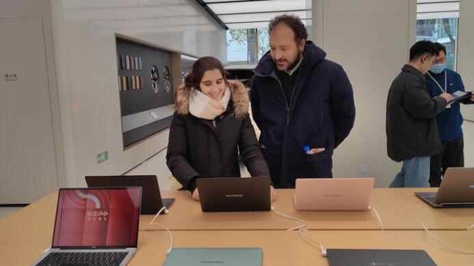 2025年1月,意大利游客戴维德在位于上海市南京路步行街的华为旗舰店参观选购。新华社记者张梦洁 摄