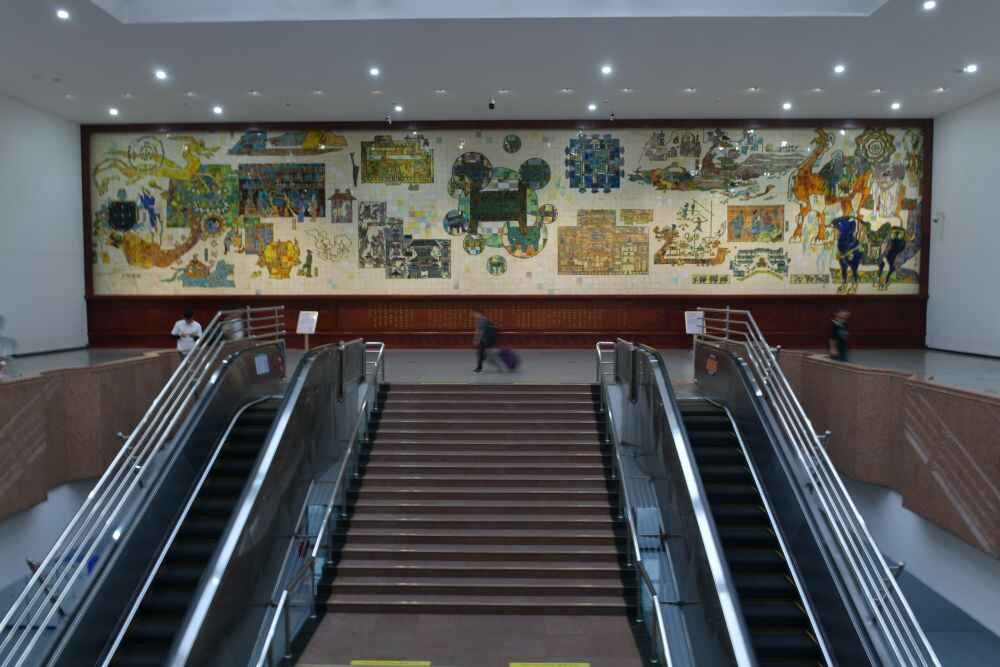 走进具有百年文化积淀的洛阳火车站,《天中春秋》巨幅唐三彩壁画映入眼帘,从唐三彩双峰骆驼俑、黑釉三彩马,到洛神飞天、龙舟杂技、唐诗三杰……一幅画读懂河洛“春秋”故事。