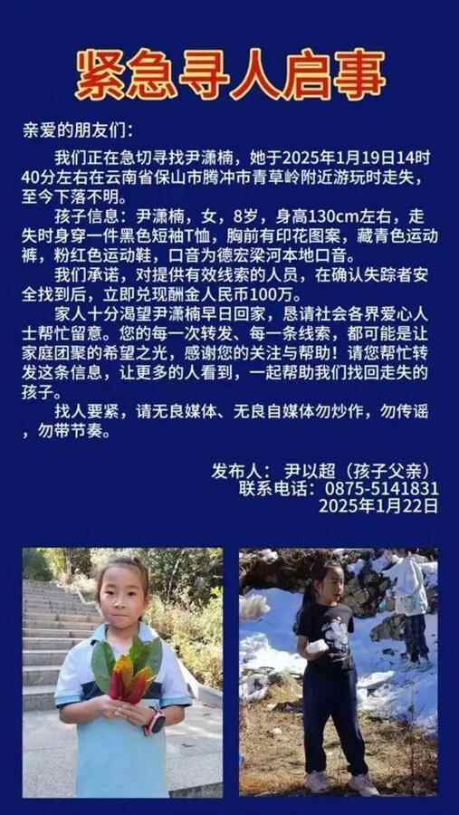 截至1月22日下午,云南腾冲8岁女童尹潇楠已经走失超72小时,其父亲悬赏100万元寻找女儿。