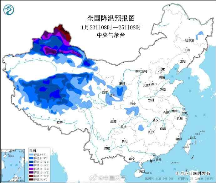 预计,1月23日08时至25日08时,新疆北部、西藏北部、青海西部甘肃西部和东北部、宁夏南部等地将先后降温8~10℃,其中,新疆北部、西藏北部等地部分地区降温可达12℃以上。新疆北部、西北地区东部等地有5~7级风、阵风7~9级,西藏大部、青海中南部、川西高原等地有5~7级风、阵风8~10级。