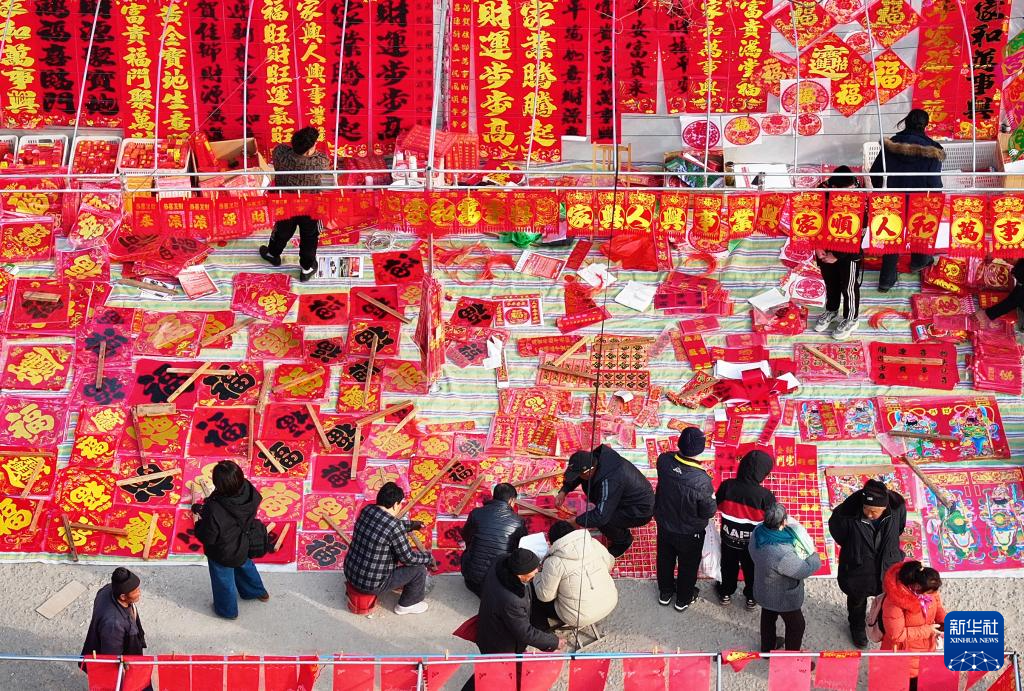 1月22日,山东枣庄山亭区徐庄镇农民在年集上选购春联(无人机照片)。