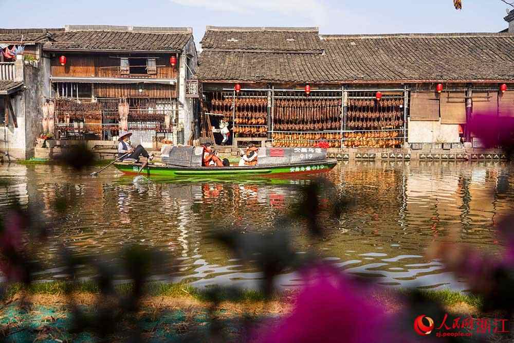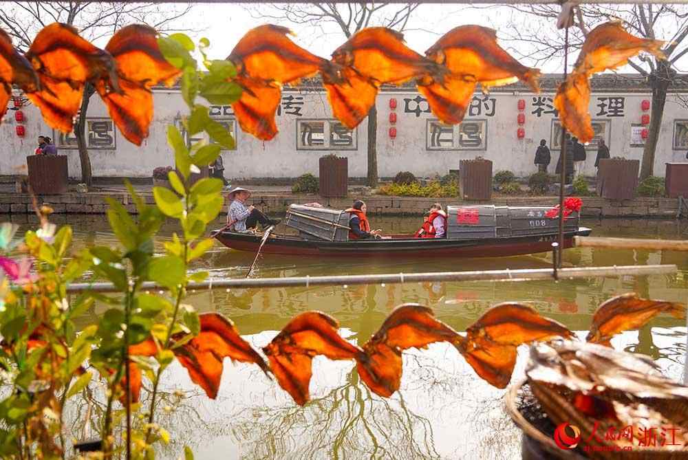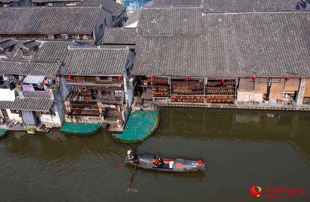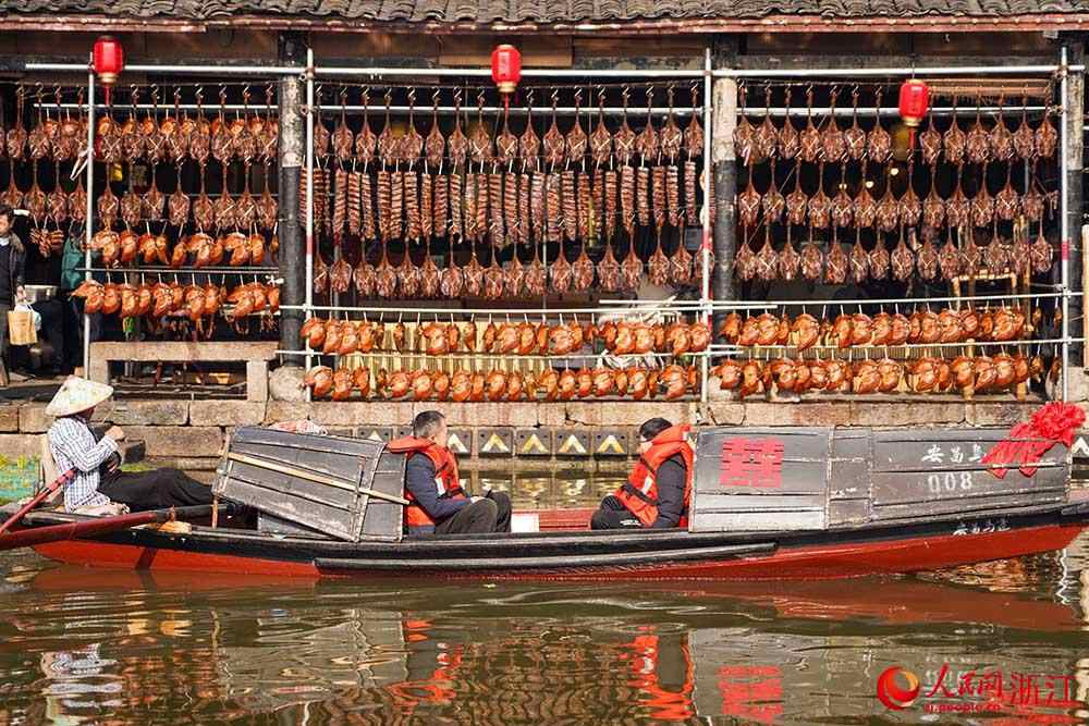 人民网杭州1月22日电 (孙鹏)临近春节,在浙江省绍兴市柯桥区安昌古镇,家家户户将腌制好的腊肠、酱鸭、鱼干等晾晒在屋檐下,让古镇充满了浓浓年味,吸引着无数游客前来体验。